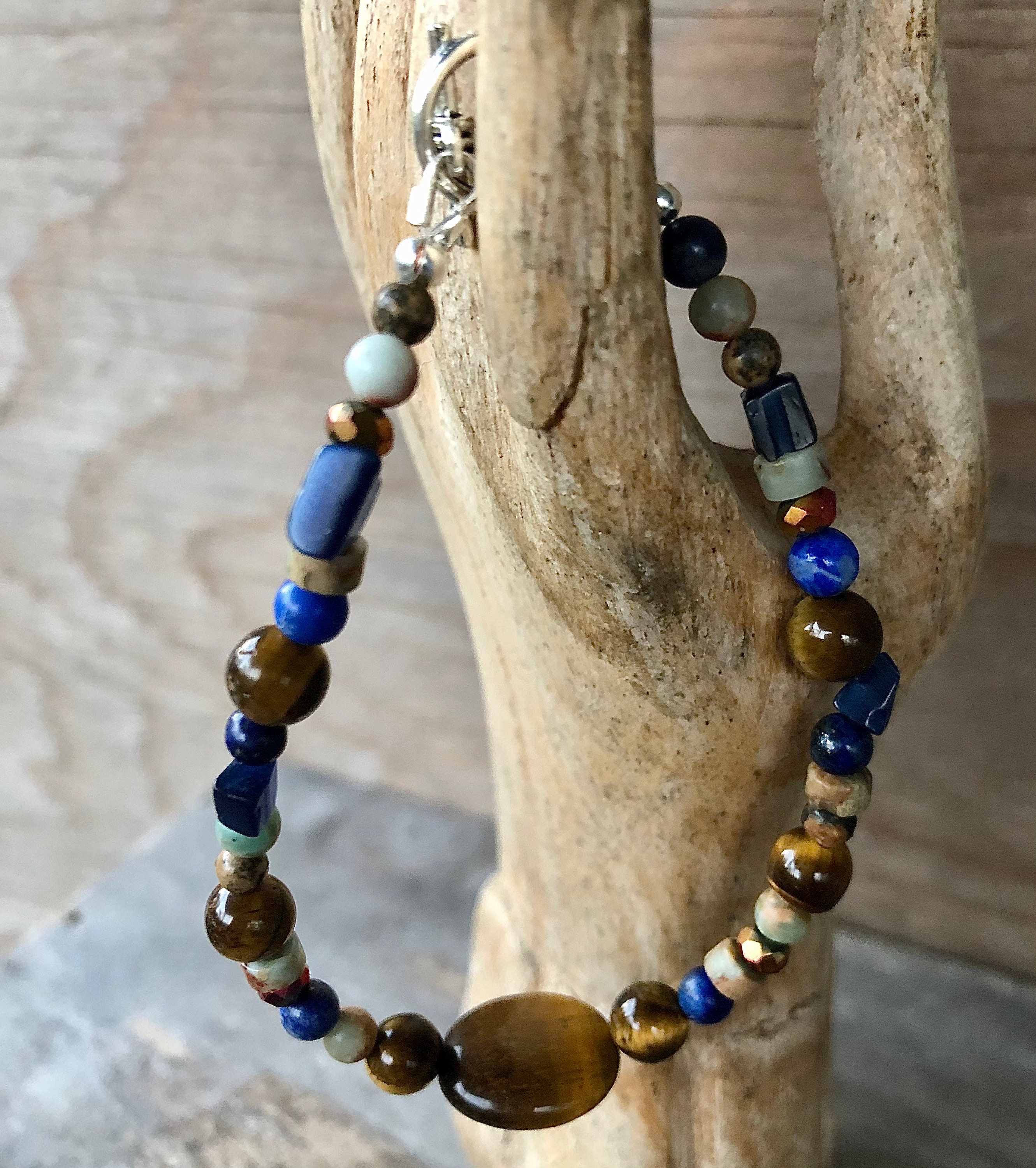 Step up your style game with this stunning 8 inch* bracelet, featuring a gorgeous combination of Tiger Eye, Quartz Crystal, Snakeskin Jasper, and Lapis Lazuli. The natural earthy tones of the gemstones make this bracelet a versatile accessory that can be dressed up or down, depending on the occasion. With its sophisticated design, this bracelet is perfect for a formal setting, but also versatile enough to pair with a casual outfit for a stroll at the Frog Pond with someone special. For those looking to complete the set, coordinating necklace and earrings are also available separately. Elevate your jewelry collection with the natural beauty and elegance of this stunning gemstone bracelet. Order now and make a statement with your fashion choices!