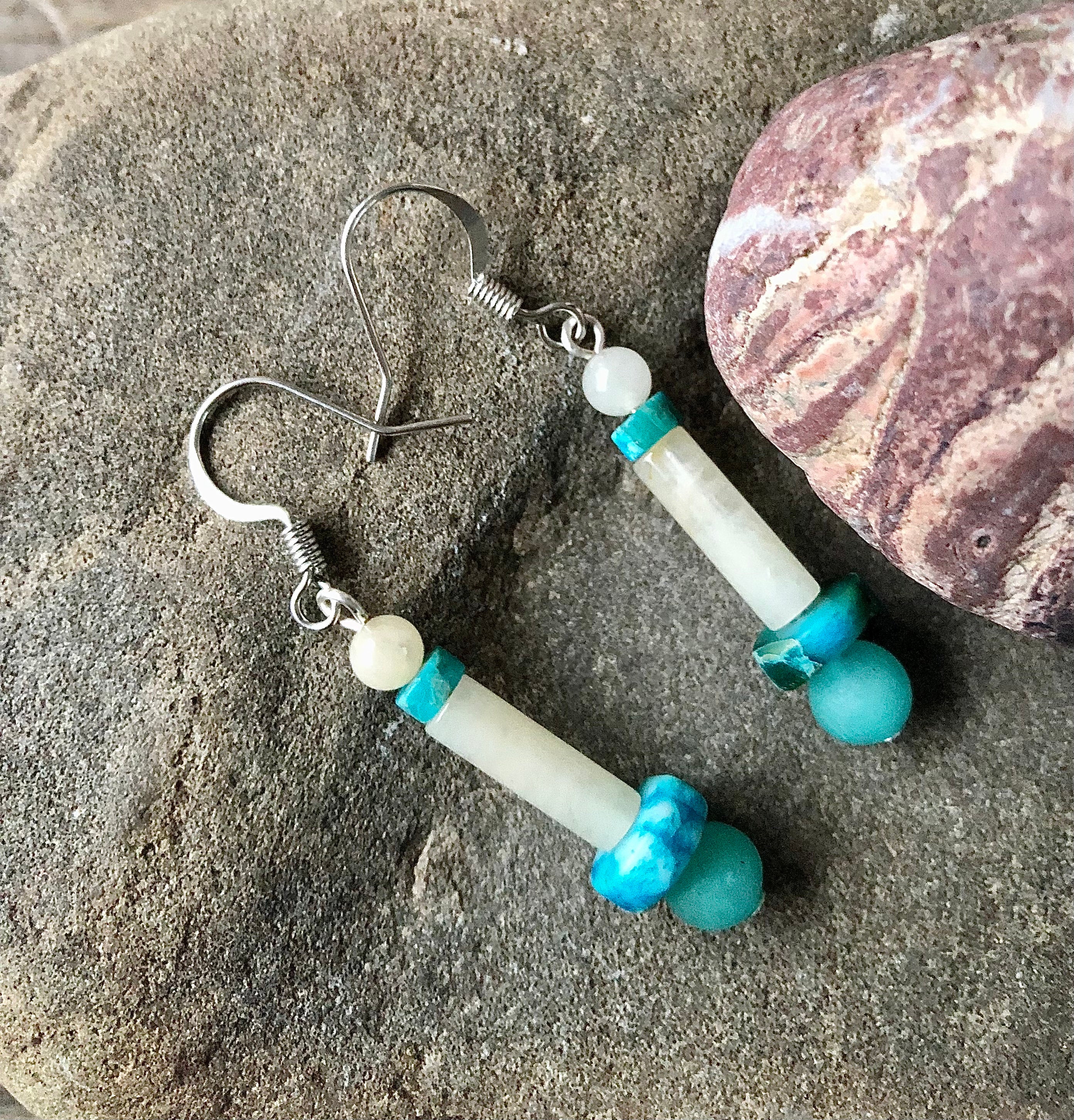 Looking for a fun and unique piece of jewelry that can add a touch of whimsy to your look? Look no further than these beautiful 2 inch gemstone earrings featuring turquoise Ocean Jasper, ivory Quartz, and Rock Crystal. These earrings are the perfect accessory for any occasion, and their versatility makes them a must-have in any jewelry collection. These earrings are so pretty and would be the perfect accessory for an excursion to warmer climes. They would also be fabulous on a dog walk in the Point Pleasant Park. The beautiful contrast of turquoise and ivory adds a touch of whimsy and fun to this beautiful jewelry. The Rock Crystal adds a touch of sparkle and warmth to these beautiful earrings. If you're looking to complete the look, coordinating necklace and bracelet are also available separately. Don't miss out on this beautiful and fun jewelry that's sure to turn heads and make you feel beautiful and confident wherever you go.