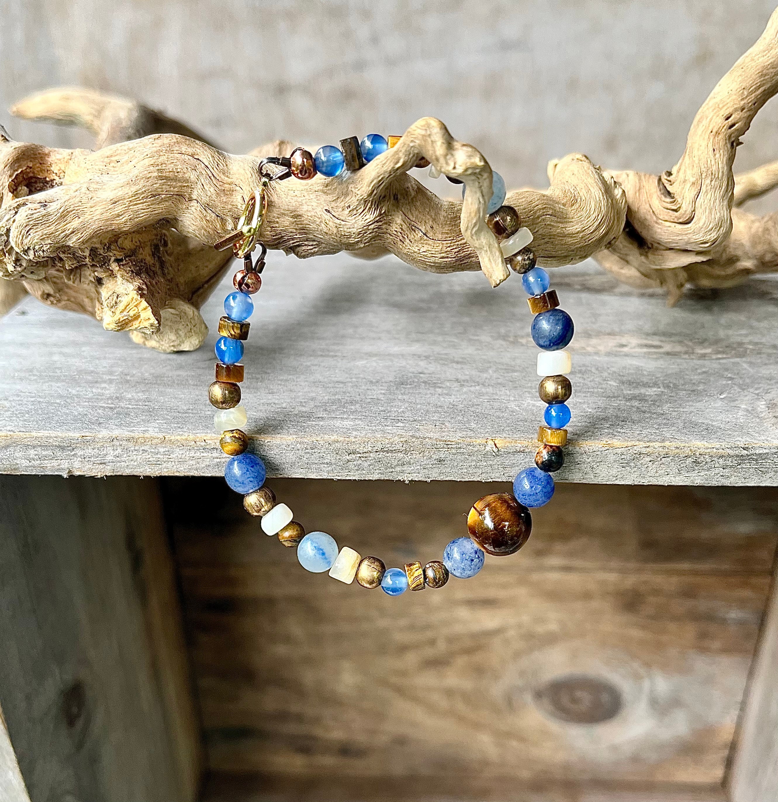 Elevate your style with this exquisite 7.75-inch bracelet featuring a harmonious blend of gold Tiger Eye, blue Aventurine, and blush Sunstone, accented with Copper. This versatile piece is perfect for any occasion—elegant enough to make a statement in a formal setting, yet earthy enough to complement a casual outfit. Pair this unique bracelet with coordinating earrings and a necklace, available separately, to complete your look. Don’t miss out on this one-of-a-kind piece of jewelry.