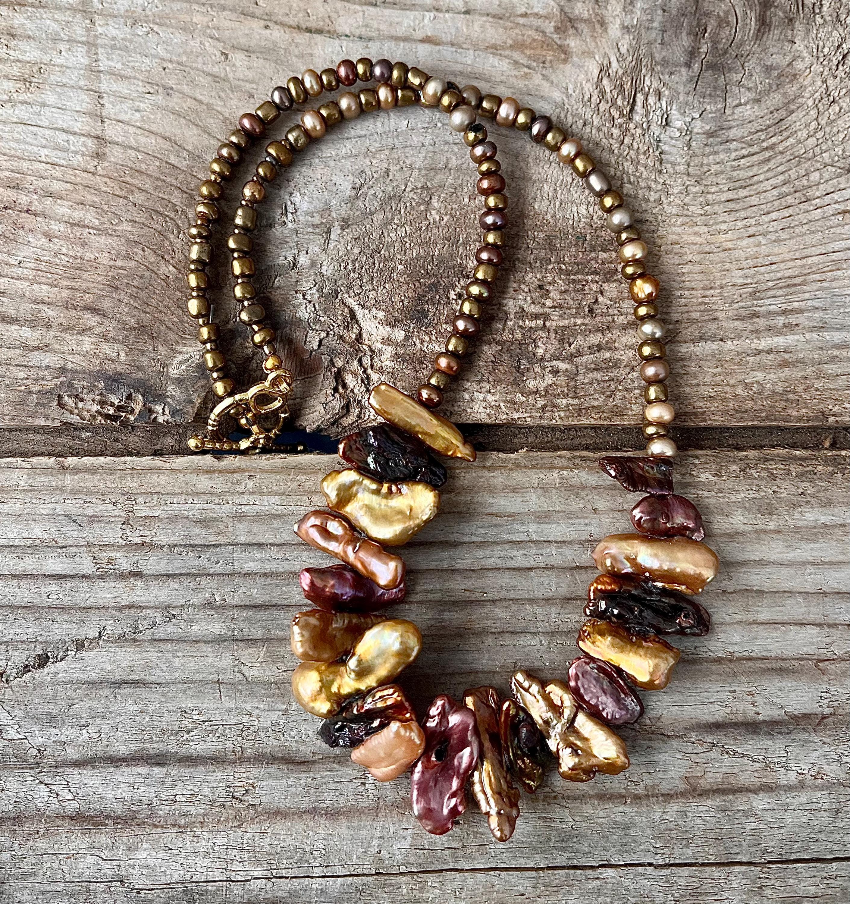 Check out this one-of-a-kind necklace. This stunning Freshwater Pearl necklace is truly a showstopper! Featuring rich shades of copper, gold, and bronze, each luminous pearl catches the light beautifully, creating an elegant yet bold statement. Whether you're dressing up for a black-tie event, celebrating a special occasion in a chic cocktail dress, or adding a touch of glam rock to an edgy ensemble, this necklace is the perfect finishing touch. This versatile and stylish piece effortlessly transitions from day tonight. And if you are someone who likes to make a true statement, matching earrings & bracelet available separately to complete the look. Make an impression with timeless elegance and modern flair!