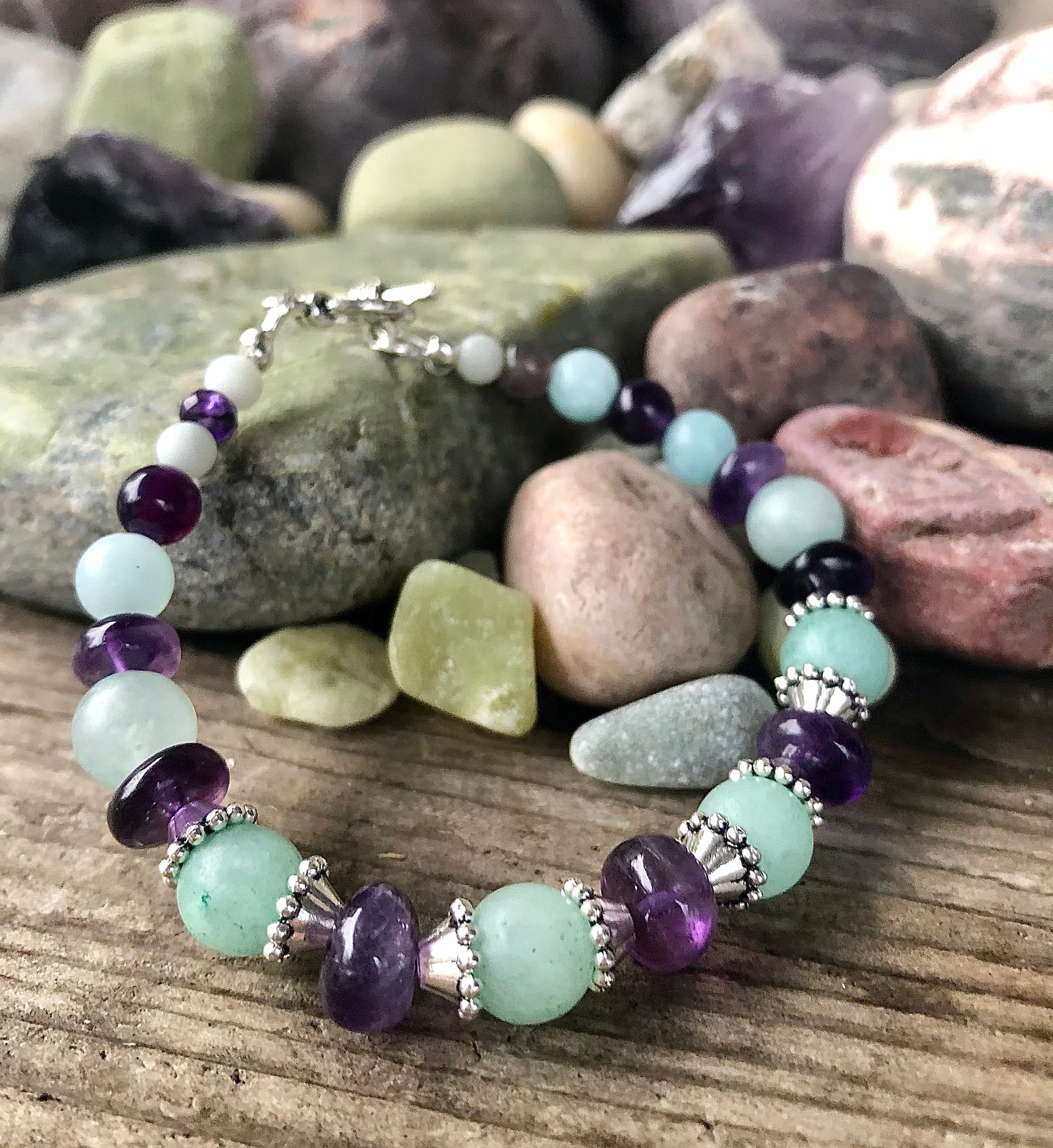 Add a touch of elegance to your jewelry collection with this beautiful 8 inch* bracelet featuring Amethyst and Amazonite, accented with cool Silver bead caps. The stunning combination of these two stones creates a unique and eye-catching design that is sure to impress. This bracelet is versatile and can be worn with any outfit, whether it's for a casual book club meeting or a fancy office soiree. The Amethyst and Amazonite stones are carefully selected for their quality and beauty, and expertly cut and polished to enhance their natural colors and textures. This bracelet is just one piece of a coordinating set that includes matching earrings and a necklace. You can mix and match or wear them all together for a cohesive look. Each piece of this set is handmade with care, using high-quality materials to ensure durability and longevity. This bracelet is sure to become a staple in your jewelry collection and is perfect for adding a touch of elegance to any outfit. Whether you're treating yourself or shopping for a gift, this stunning bracelet is a must-have. Order now and enjoy its beauty for years to come!